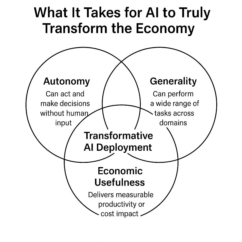 Only when an AI system scores high across all three — it's autonomous, general, and economically impactful — can it drive the kind of broad-based economic transformation seen with past general-purpose technologies like electricity or the internet