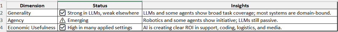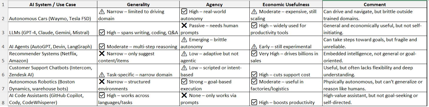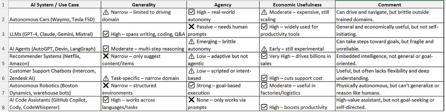 Let’s take a look at the current state of real-world AI systems across the three dimensions: Generality, Agency, and Economic Usefulness.